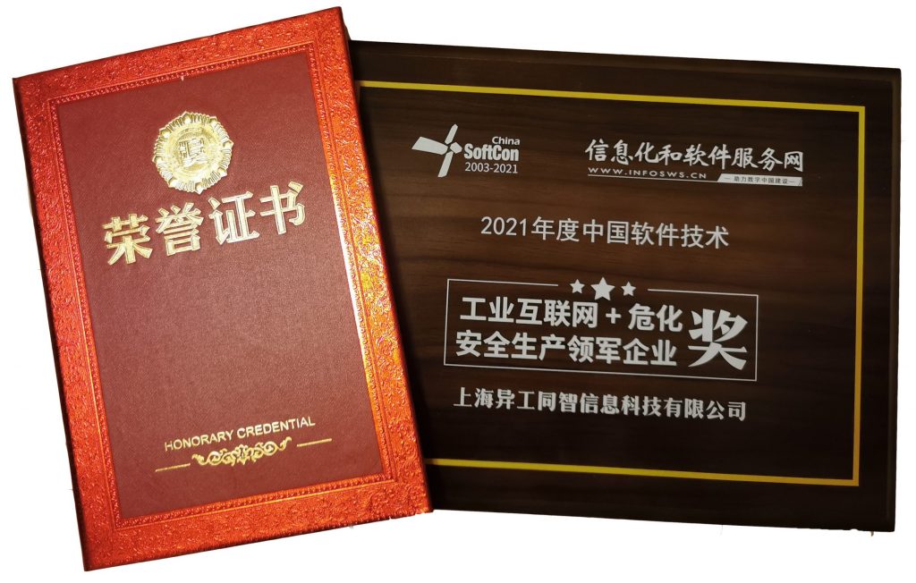 會上頒布了2021中國軟件技術創新標桿企業及個人、創新標桿軟件產品、解決方案、應用服務等獎項評選結果。上海異工同智信息科技有限公司榮獲技術創新標桿企業獎項——工業互聯網+危化安全生產領軍企業。