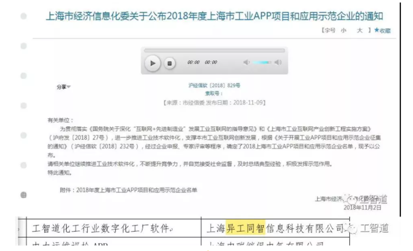 在上海市經(jīng)濟信息化委公布的2018年度上海市工業(yè)APP項目和應(yīng)用示范企業(yè)通知中,憑借“工智道化工行業(yè)數(shù)字化工廠軟件”榮幸登榜。