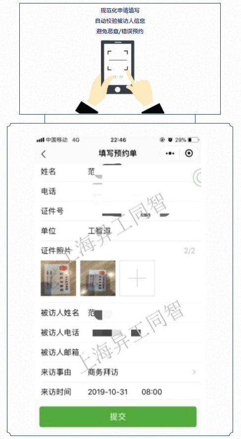 大型化工企業每日有大量的承包商,訪客人員進出。傳統的訪客登記方式過于簡單,效率較低。工智道的“訪客預約管理系統”,利用微信小程序,在線預約,不僅能夠有效地預防人口聚集,減少交叉感染;還能提高訪客申請處理效率,完善人員管理制度,更規范/更便捷/更科學地利用最少的資源創造出最大的價值。